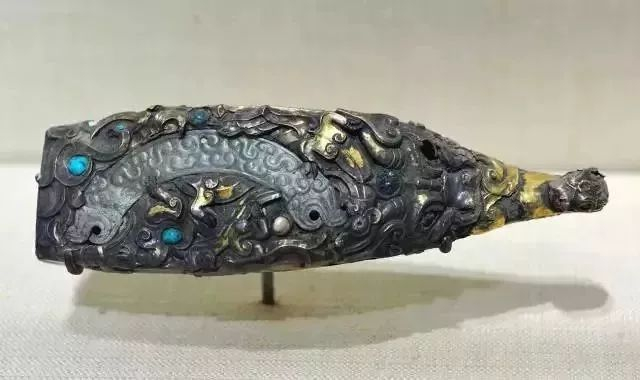▲镶嵌珍珠、绿宋石和玉璜的镀金带钩 战国时期 长16.5cm