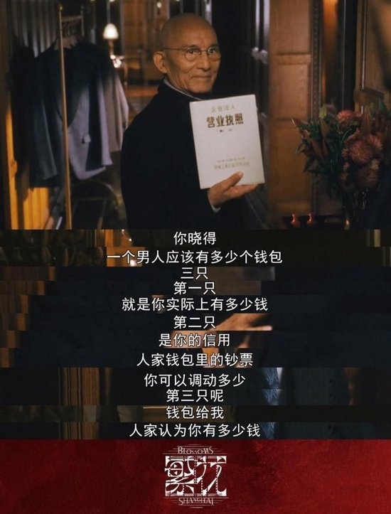 《繁花》中的“老法师”爷叔,永远气定神闲,从容不迫。作为宝总成功路上的引路人,他教会宝总做生意应该有派头、噱头、苗头,并贡献了不少经典台词。
